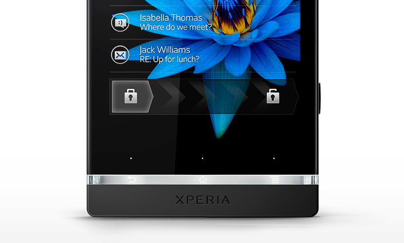 這是優點也是缺點,當初就是被透明光帶的外觀所吸引,然而Xperia S的按鍵卻不是放在透明光帶上,也不是放在透明光帶上的那三個小點,而是這兩者之間一個非常曖昧的位置,所以要按這三個按鍵最好的方式就是──從光帶的位置往上滑動。
