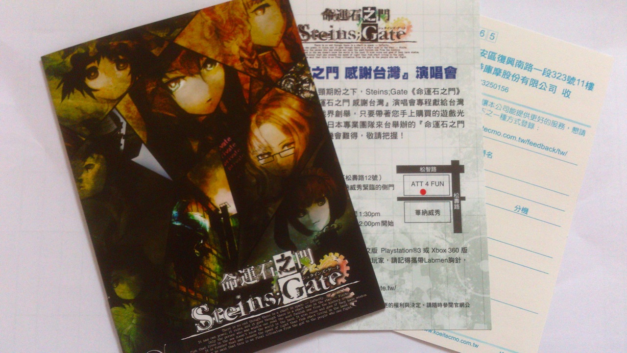 光碟的外觀沒有什麼差別,內附一本非常薄的中文說明書以及「命運石之門 感謝台灣」演唱會的資訊和光榮代理遊戲一貫會有的意見表。