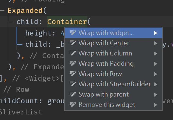 有些情況如果 widget 層級過深的話,比起 JSX 或 HTML 來說,要搬移或是修改會稍微困難一點。好在 IDE 提供了非常方便的功能,可以輕鬆的修改 widget 層級。